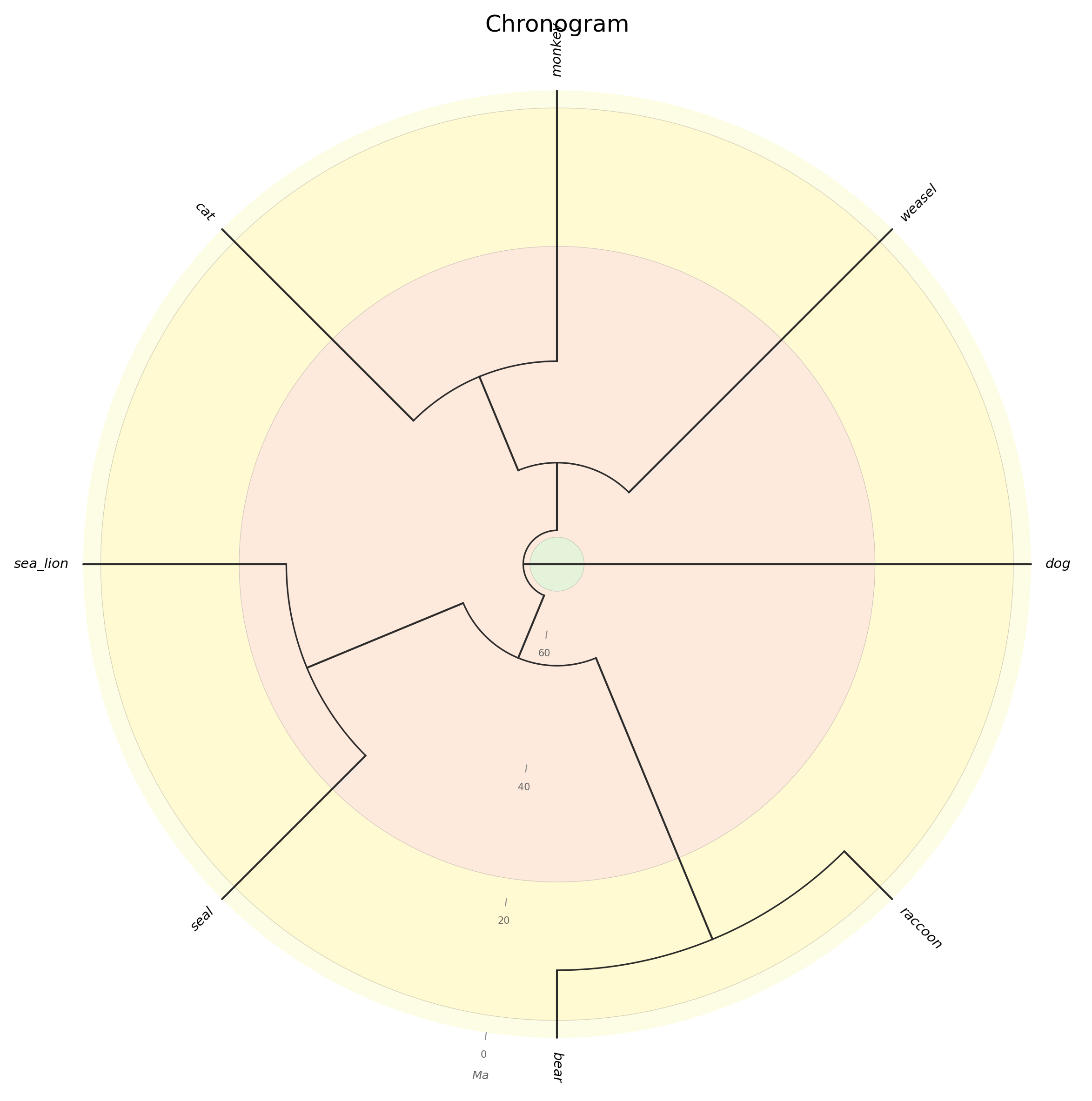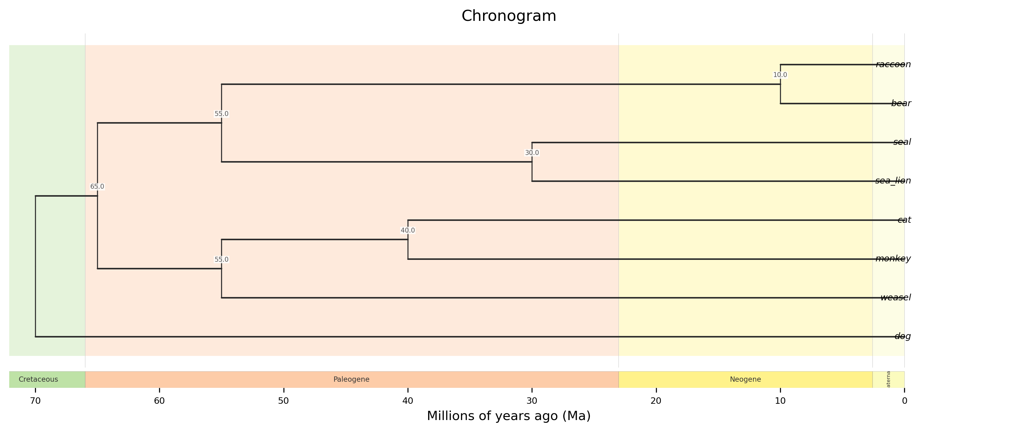 Chronogram: Time-calibrated tree with geological timescale (rectangular or circular)