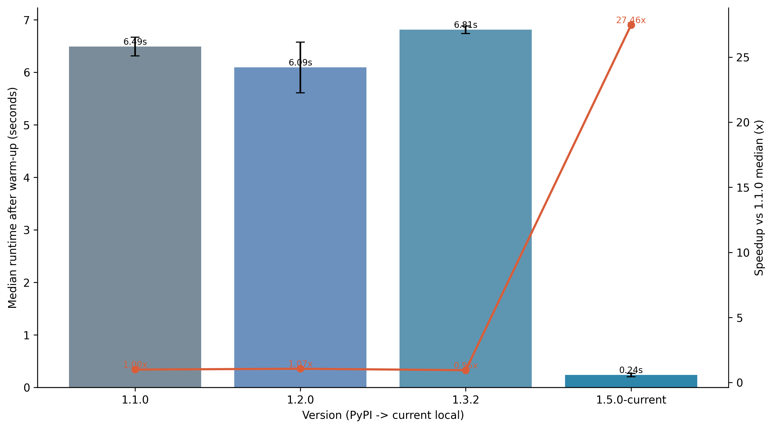 The chart below summarizes benchmarked runtime across selected PyPI releases and the current local version. Runs used a rooted input tree (-r), one warm-up run per version, and three measured runs per version on the same dataset.